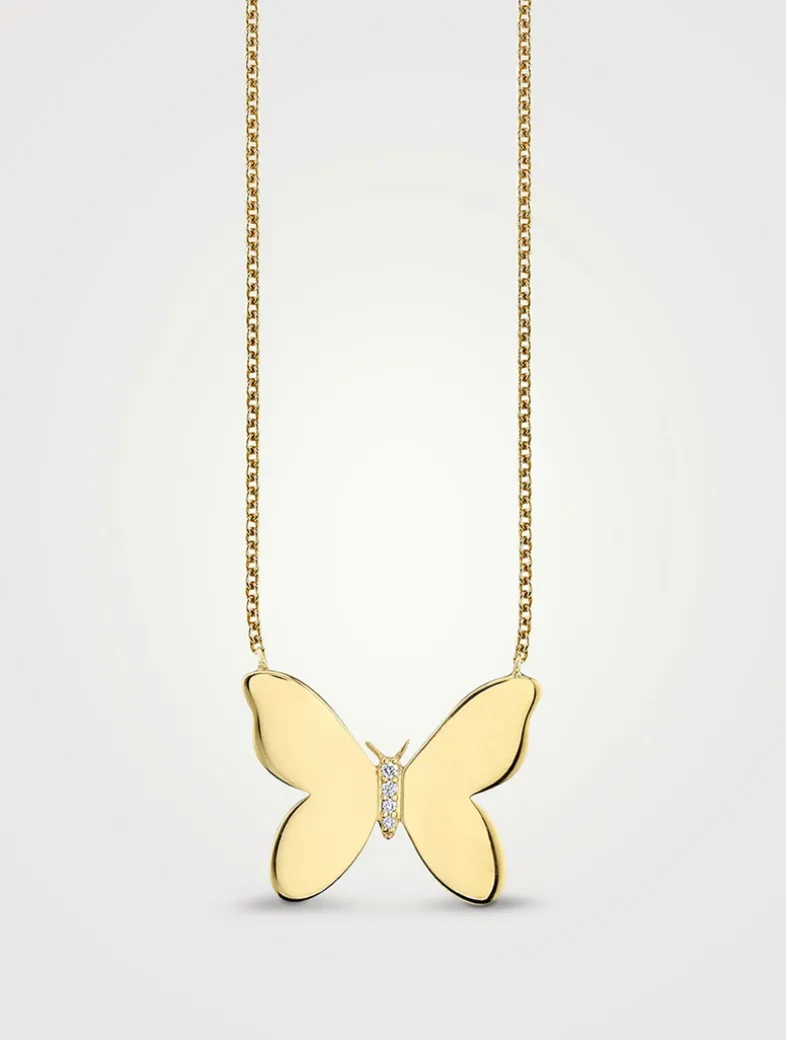 This delicate chain necklace features an elegant butterfly with gleaming 14k gold wings, accented by a pavé-set diamond centre that adds a sparkling touch.