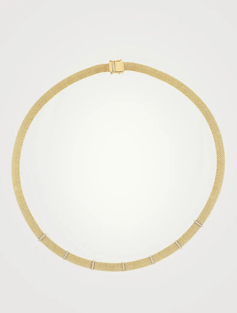 Made from a flexible woven gold mesh, this modern minimal piece is accented by five diamond-encrusted bars.