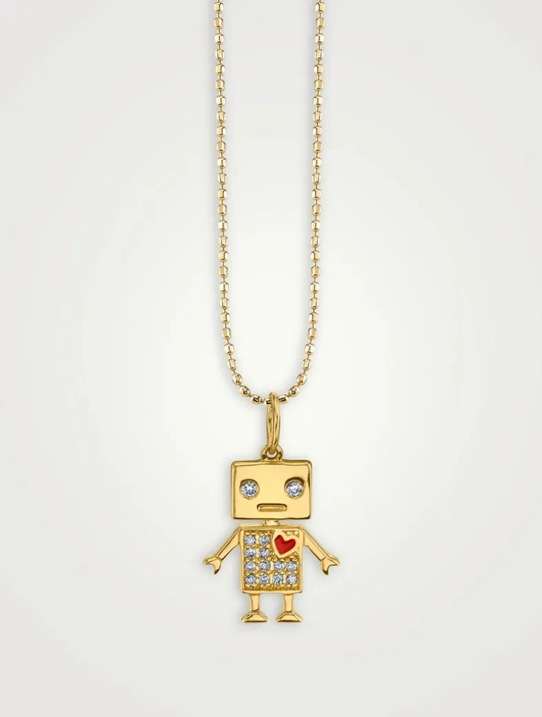 Made with a fine 14k gold ball chain, this necklace features a robot charm with pavé diamonds and an enamelled heart.