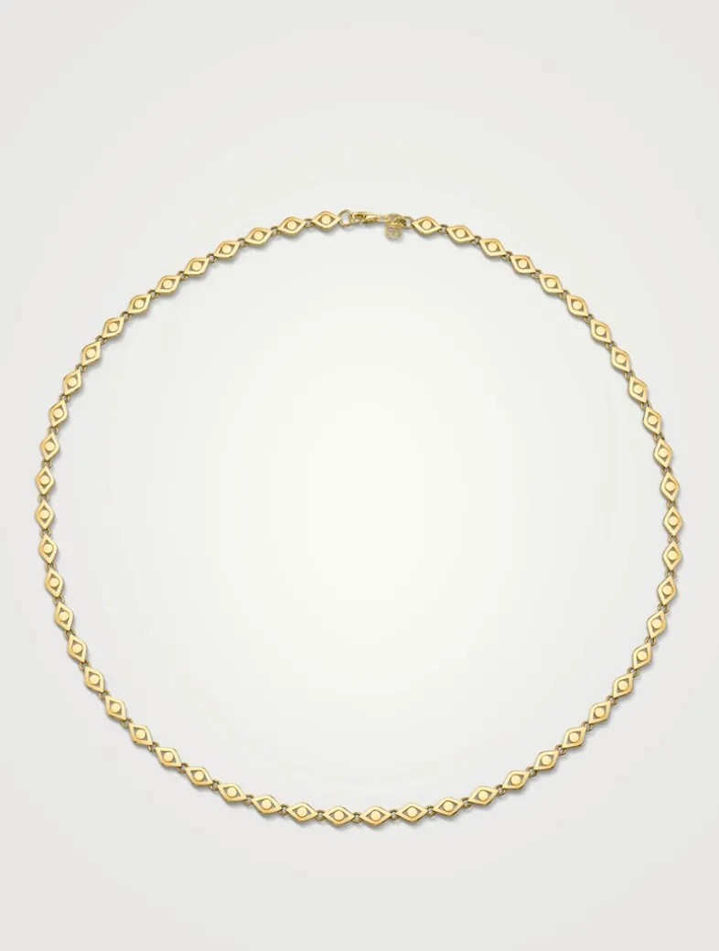 Combining beauty with protective symbolism, this 14k gold necklace is composed entirely of linked evil eye charms, forming a seamless and elegant strand.