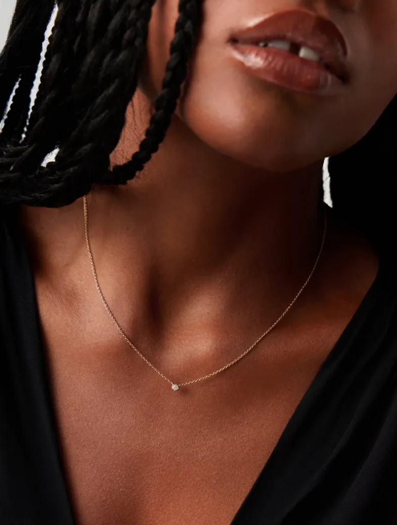 This timeless necklace features a floating solitaire diamond in a bezel setting on a classic 14k solid gold chain. Wear solo or layer with more fine chains.