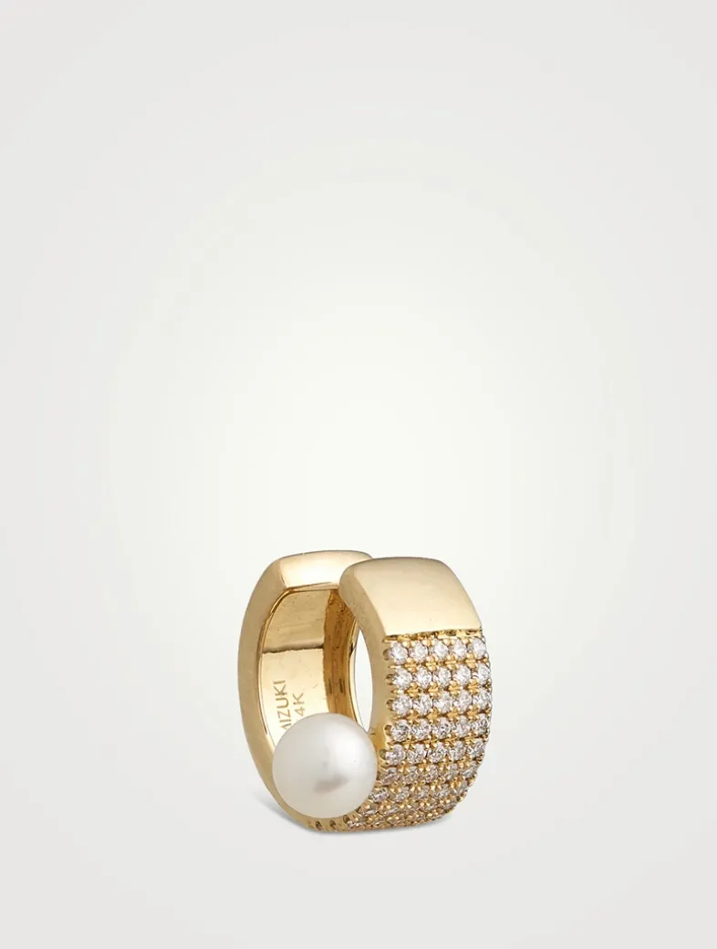 Made from 14k gold, this single ear cuff is set with one pearl and five rows of sparkling diamonds.