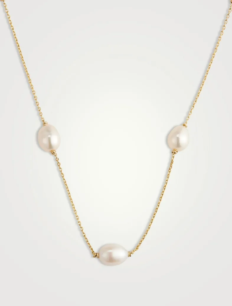 A minimalist design, this dainty everyday piece features lustrous pearls stationed along a delicate 14k gold chain.