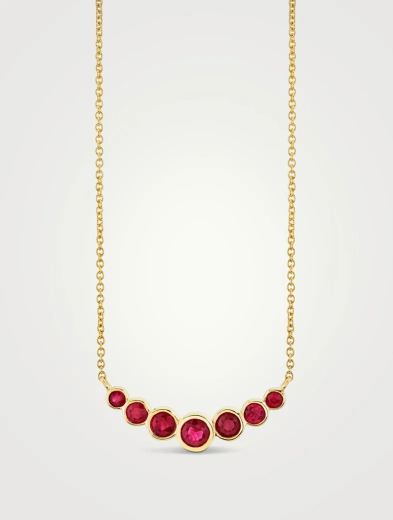 Crafted in 14k gold, this curved bar necklace features a graduated row of bezel-set striking rubies—a design that represents a journey of growth and transformation.