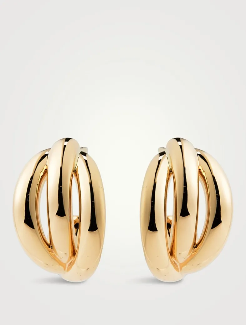 These hollow 14k gold huggie hoops are designed with overlapping hoops creating a knotted look.