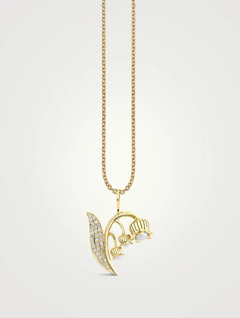 Crafted in 14k gold, this elegant necklace features a lily of the valley charm with a diamond-studded leaf and pearl-tipped blossoms.
