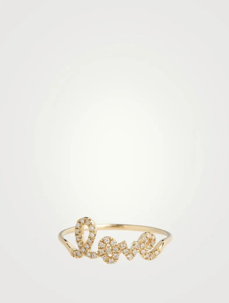This 14k gold ring features a pavé diamond love design spelled out in signature SYDNEY EVAN script.