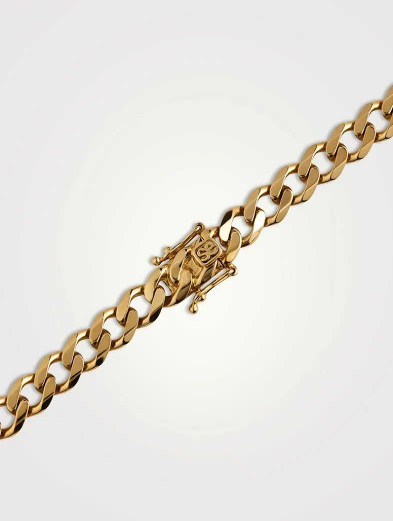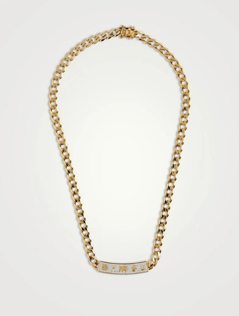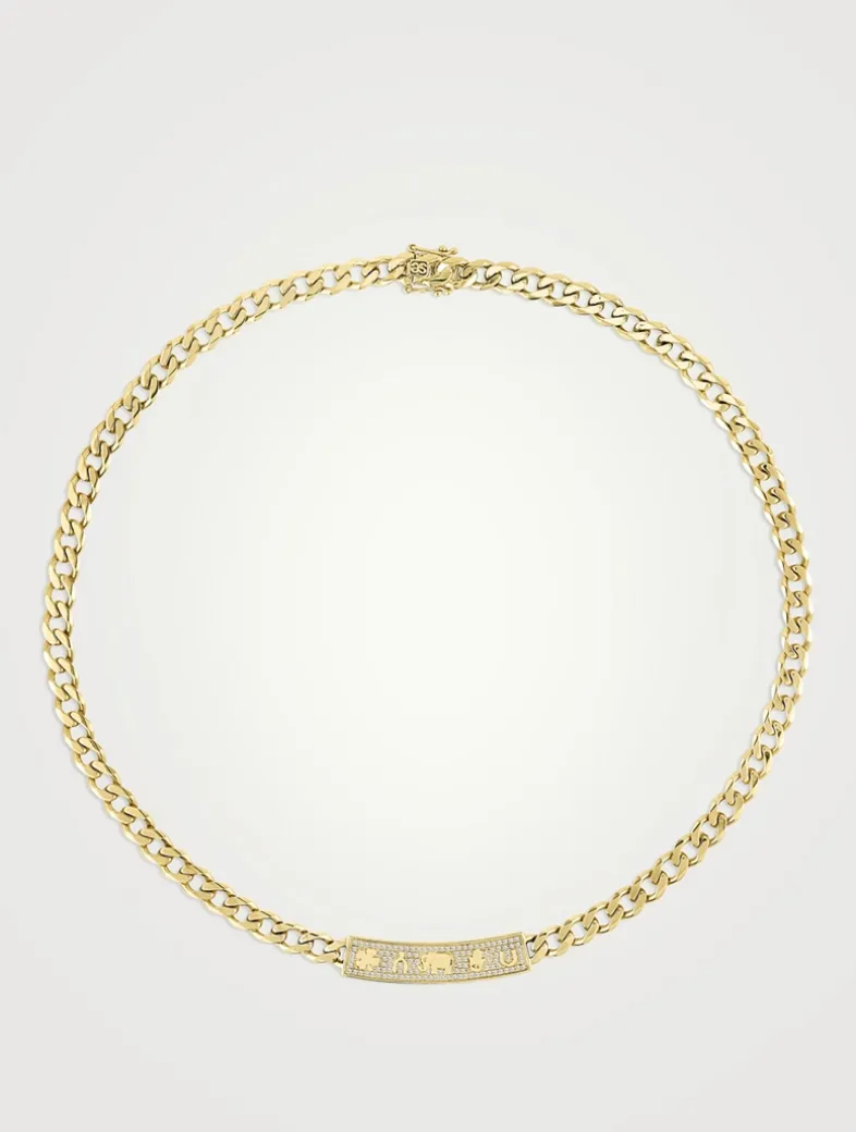 This polished curb chain is designed with a signature bar detail. Covered in diamonds, the bar features a clover, a wishbone, an elephant, a hamsa and a horseshoe for good luck.