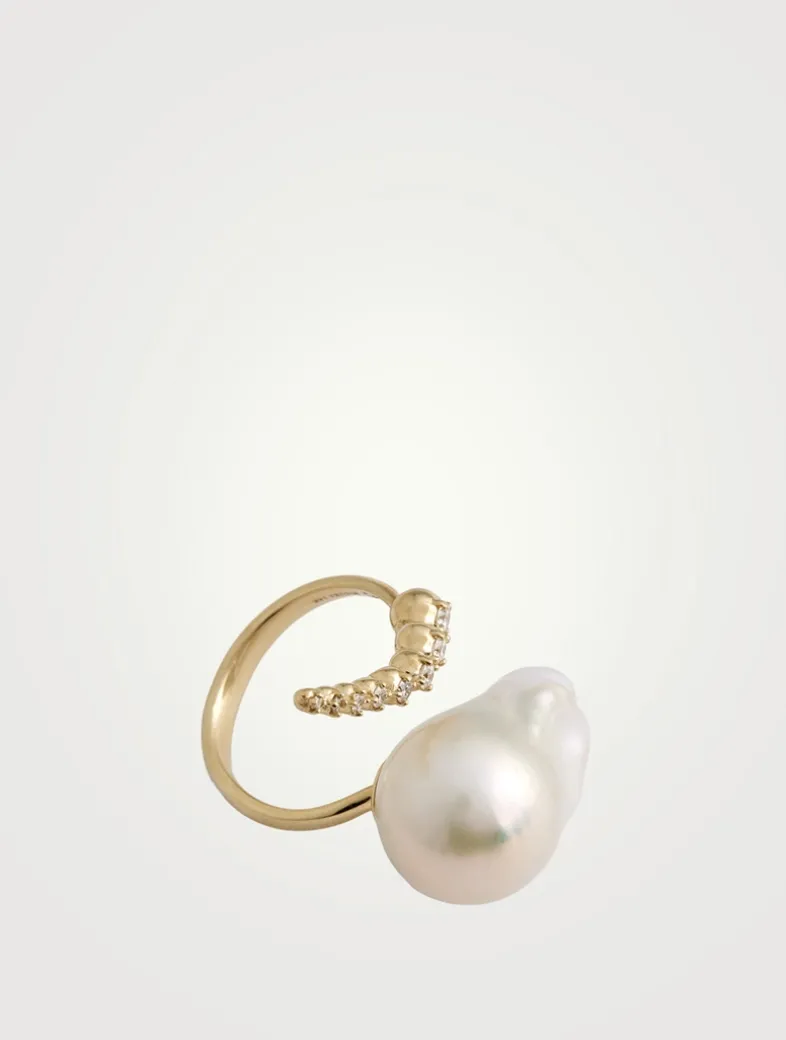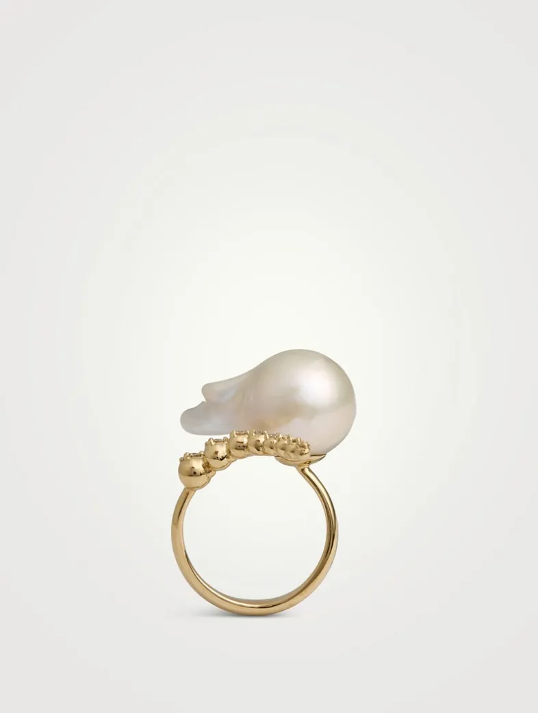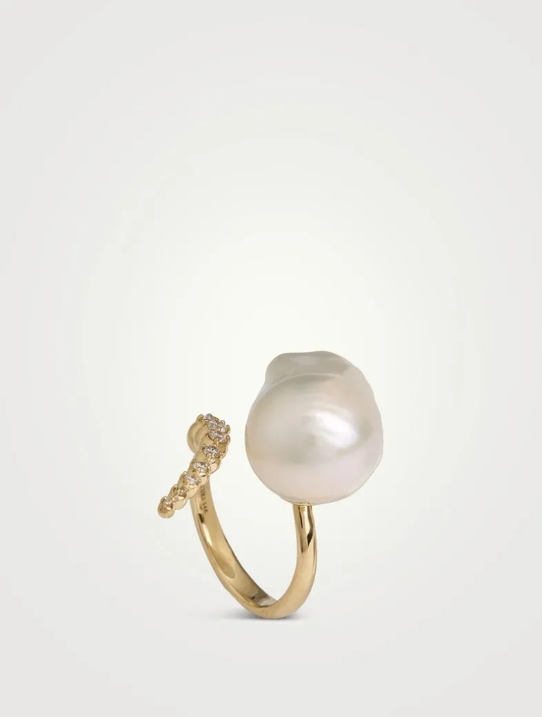Featuring a large, organically shaped pearl, this slender ring of 14k gold is set with graduating diamonds.