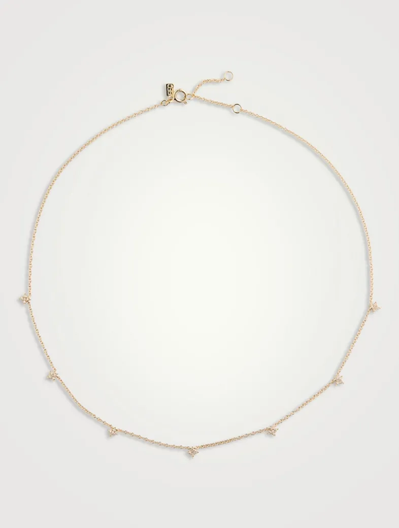 This necklace gleams with seven pavé diamond sparkle motifs set along a dainty cable chain. Natural diamonds are ethically sourced adhering to the Kimberley Process.