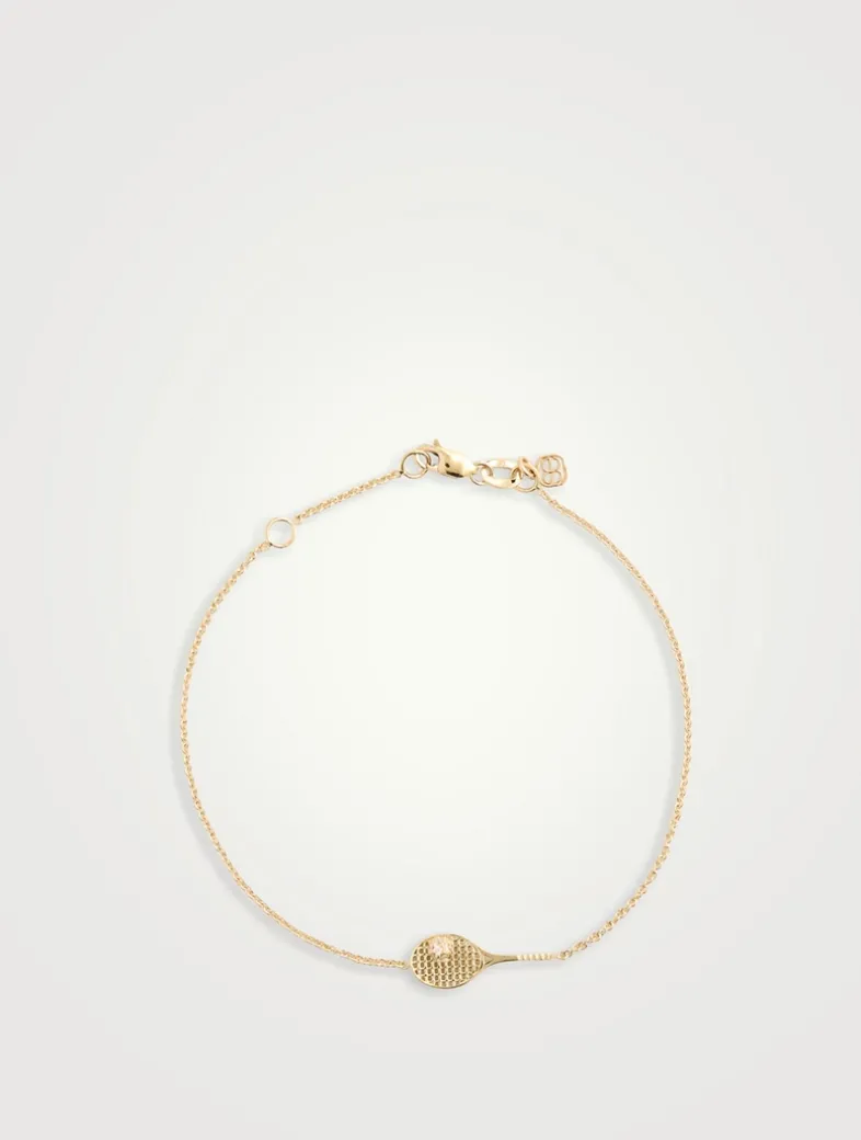This 14k gold bracelet features a diamond-accented tennis racquet, securely soldered on an adjustable cable chain for durability and a perfect fit.