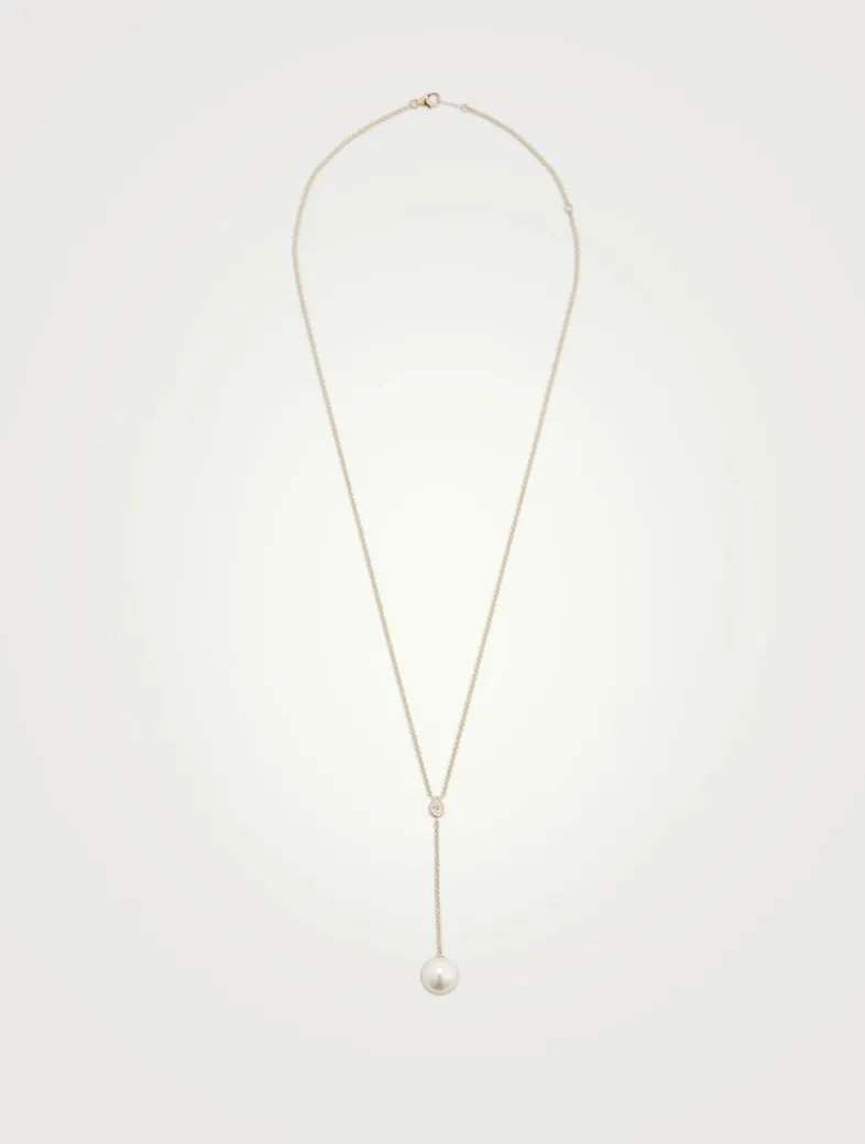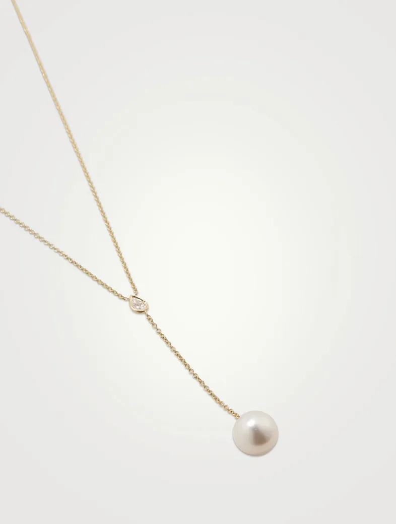 This lariat necklace features a teardrop-shaped diamond and a round South Sea pearl on the drop chain.
