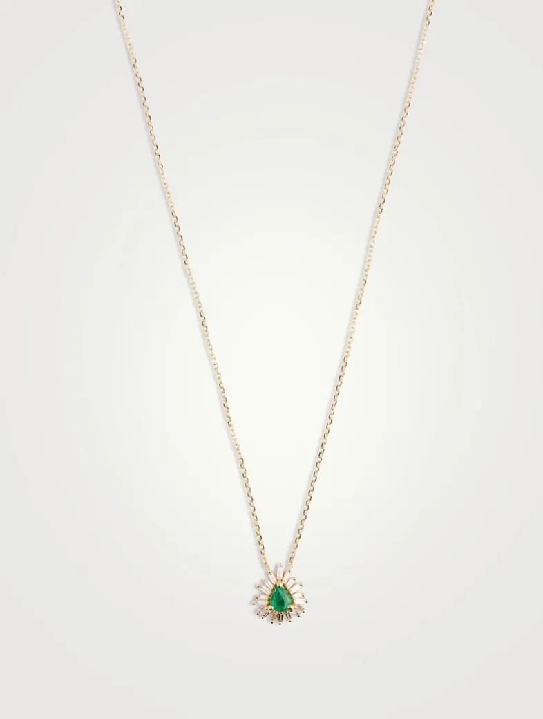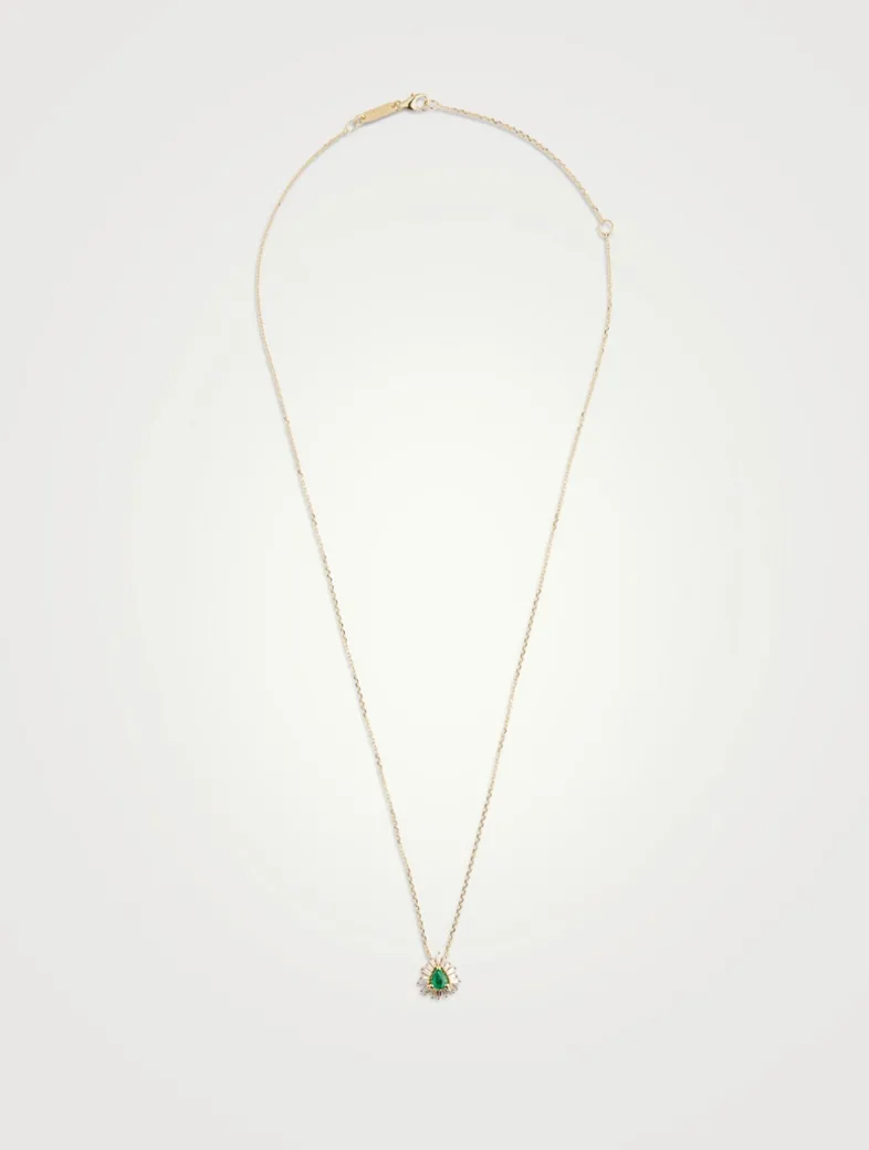 This 18k gold chain necklace features an emerald pendant surrounded by a diamond baguette frame.
