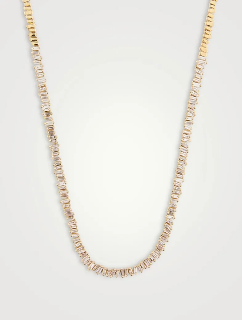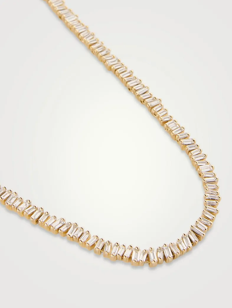 Suzanne Kalan’s innovative twist on the traditional tennis necklace is meticulously designed with over 5 carats of white diamond baguettes.