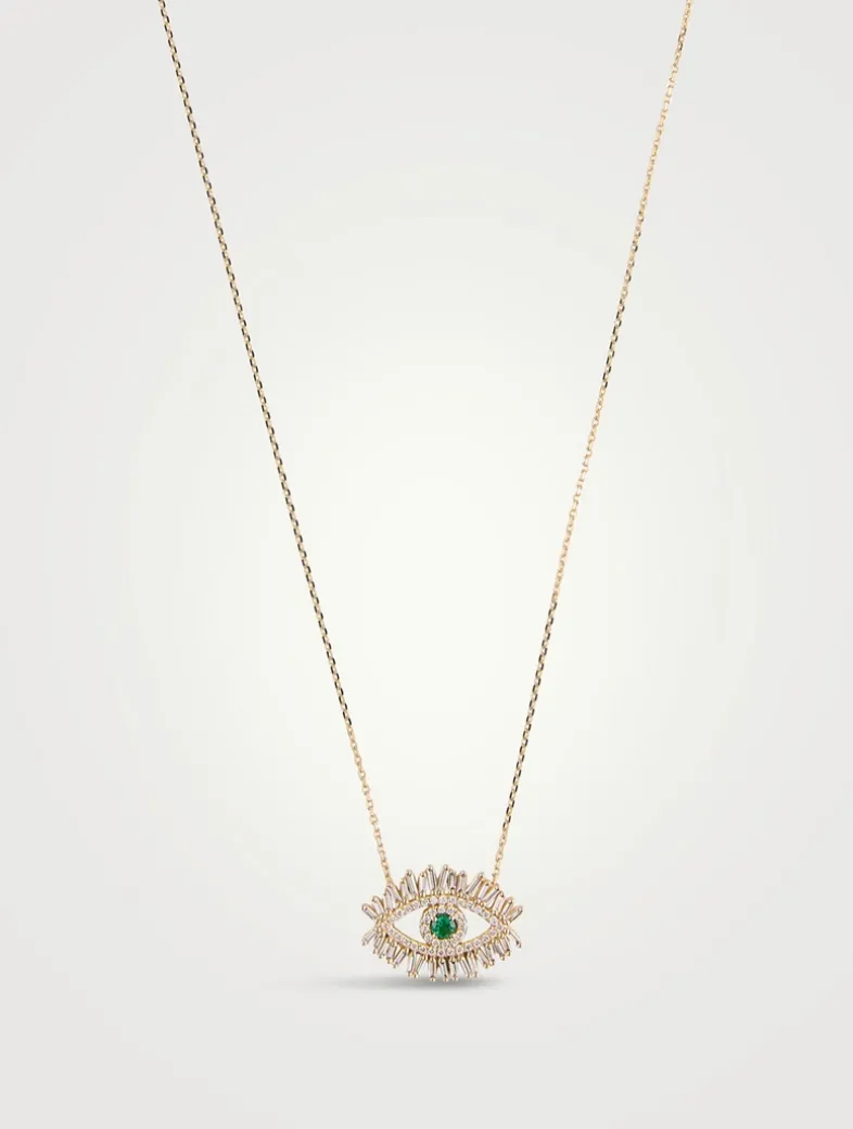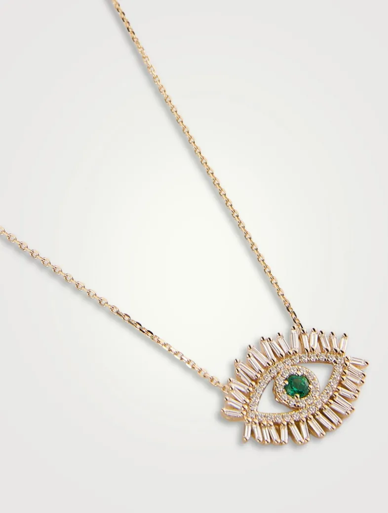 Handcrafted from 18k gold and set on a gold chain, this pendant is a contemporary interpretation of the ancient evil eye symbol. Featuring a 3mm round emerald centre stone for the eye, it is beautifully encircled by baguette and round white diamonds.