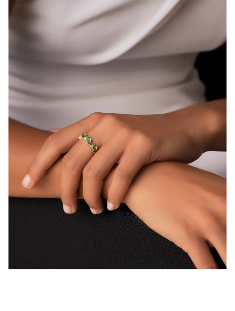 This eternity band is crafted from 18k gold and is set with meticulously arranged emerald baguettes and round white diamonds. The ring’s captivating design is typical of Suzanne Kalan’s Frenzy collection.