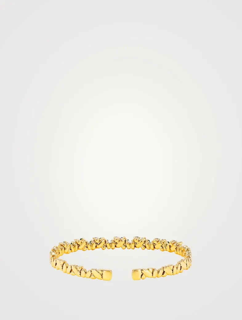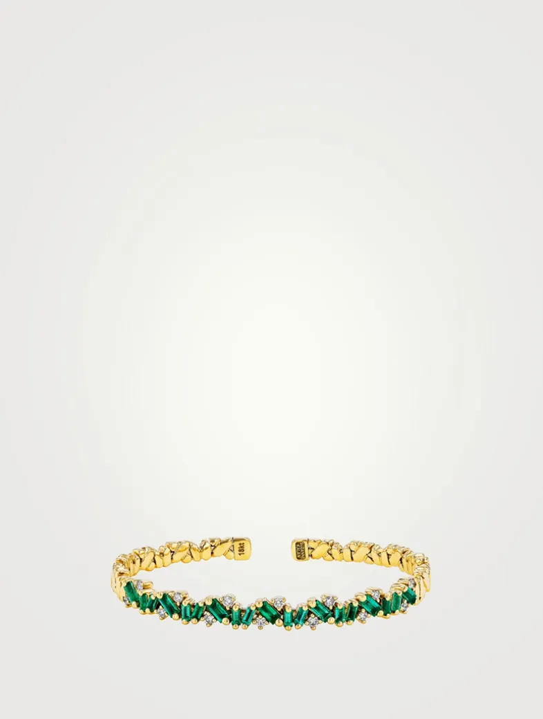 This 18k gold bangle is set with shimmering emerald baguettes and round white diamonds. From the Frenzy collection, it is made with a spring gold wire, making it easy to slip on and off.