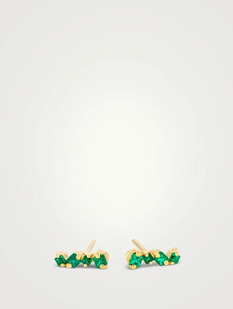 These stunning stud earrings feature vibrant emeralds in a row, adding a pop of colour against the gold setting. Part of the Golden Age collection from Suzanne Kalan, the princess-cut emeralds are a new take on the classic earring shape.
