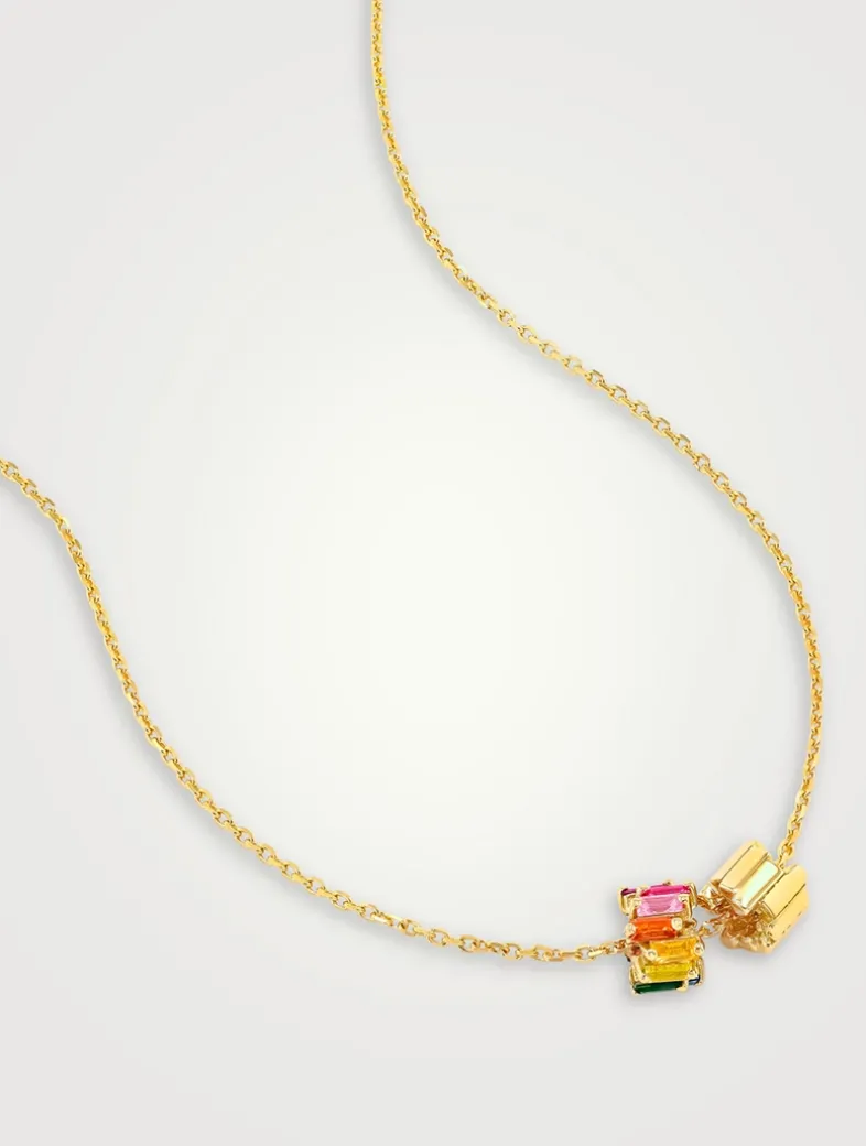 A pair of rondelle infinity pendants is eye-catching in this simple style. Crafted in 18k gold, this necklace is set with rainbow sapphire baguettes.