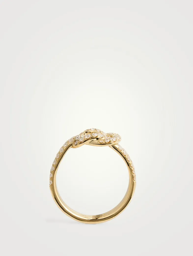 Cast in 18k gold, this banded ring features two-rows of sparkling diamonds that meet in an open knot.