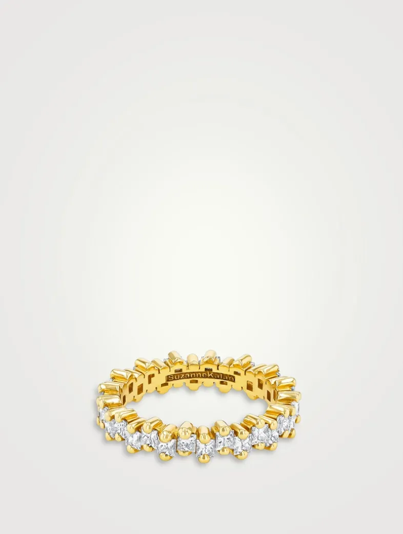 Featuring 1.58 carats of princess-cut diamonds in a unique staggered setting, this ring is a standout. Set in 18k gold for modern elegance.