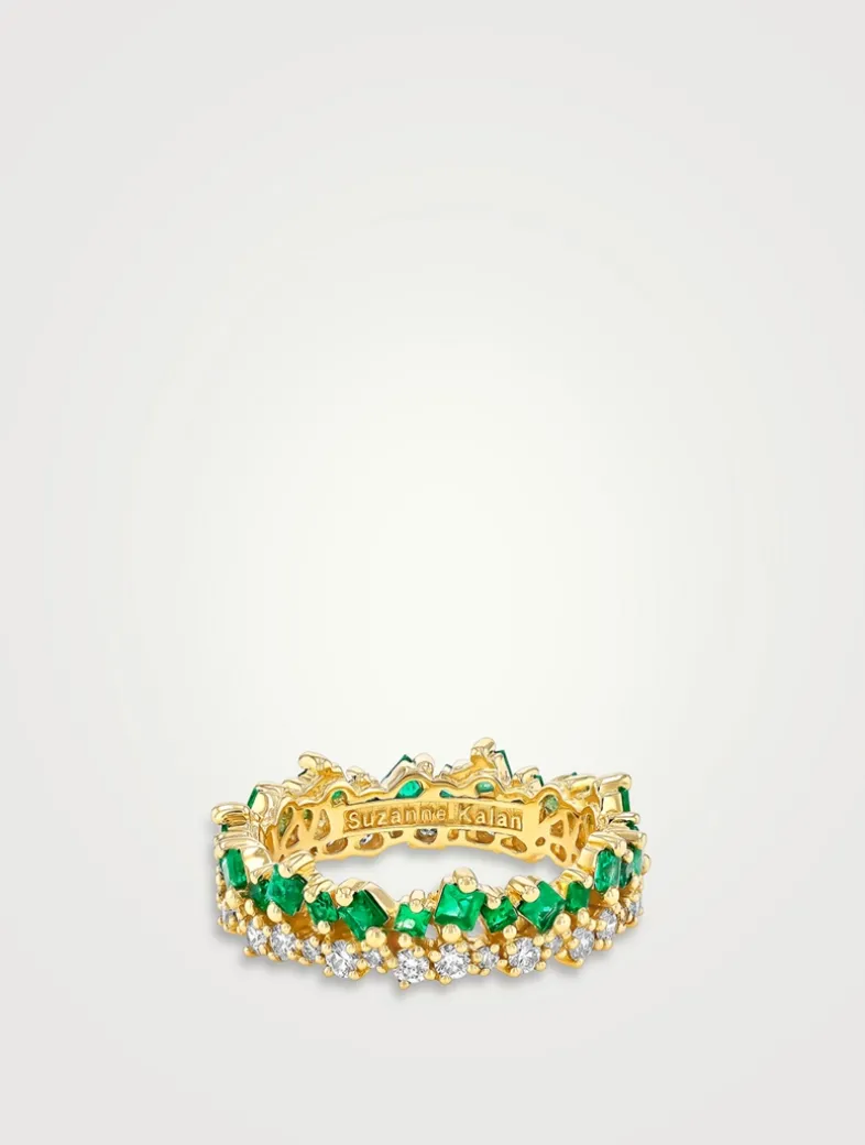 Princess-cut emeralds are balanced with a row of round diamonds illuminating this eternity band. From the Short Stack Collection by Suzanne Kalan, this ring uses the coloured gemstones to highlight the uneven setting to perfect effect.