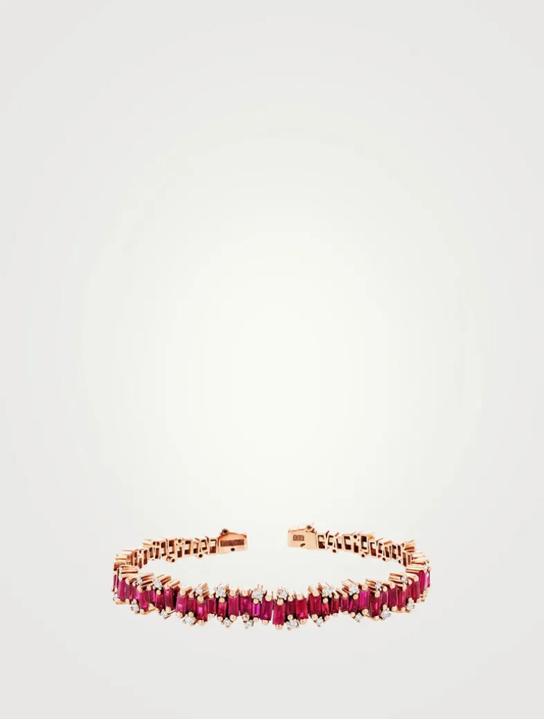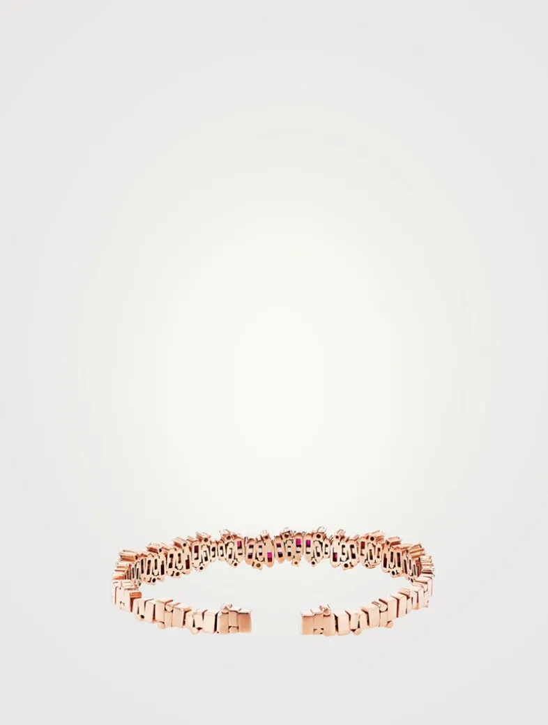 Exquisitely handcrafted in rose gold, this bangle is adorned with four carats of striking ruby baguettes accented by round diamonds. The piece is designed in Suzanne Kalan’s signature Firework motif.