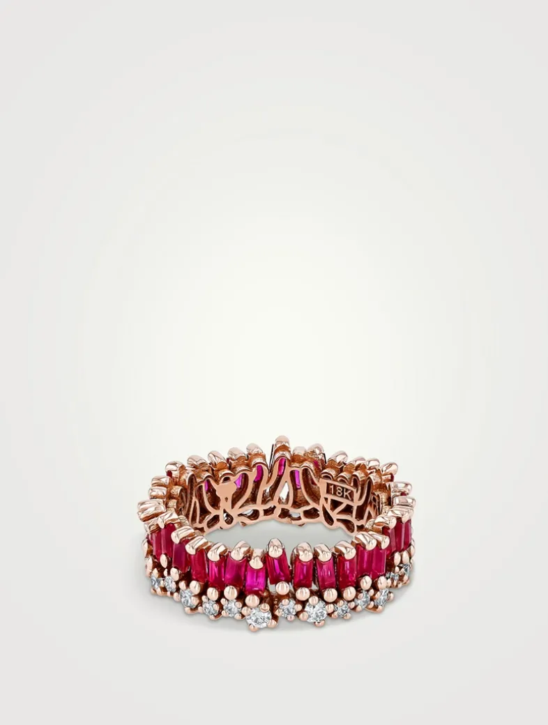 Baguette rubies are balanced with a row of round diamonds illuminating this eternity band. From the Short Stack Collection by Suzanne Kalan, this ring uses the coloured gemstones to highlight the uneven setting to perfect effect.