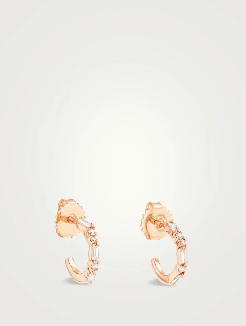Crafted in rose gold, these huggies are set with round and baguette diamonds. Lightweight and comfortable, the Thin Mix collection from Suzanne Kalan is designed for everyday wear.