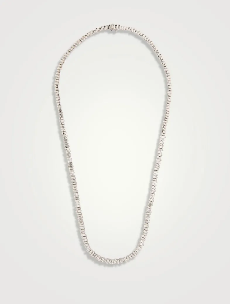 Suzanne Kalan’s innovative twist on the traditional tennis necklace is meticulously designed with over 5 carats of white diamond baguettes.