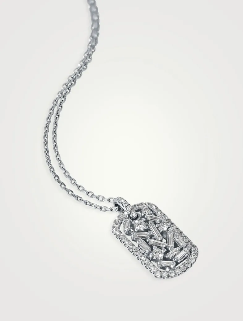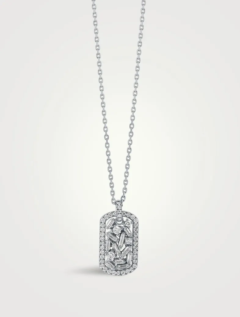 Discover a modern twist on the classic dog tag with this diamond necklace. It features a delicate row of round diamonds that encircles the scattered baguette and round diamonds in the centre, creating a mesmerizing design.