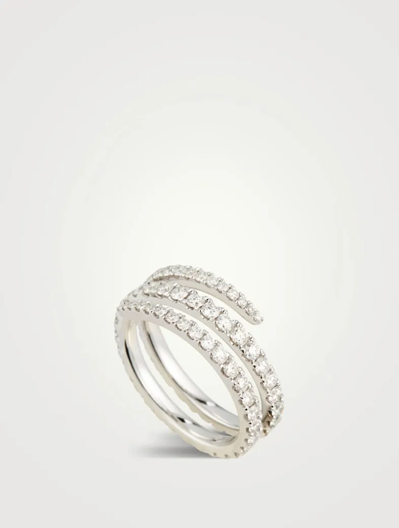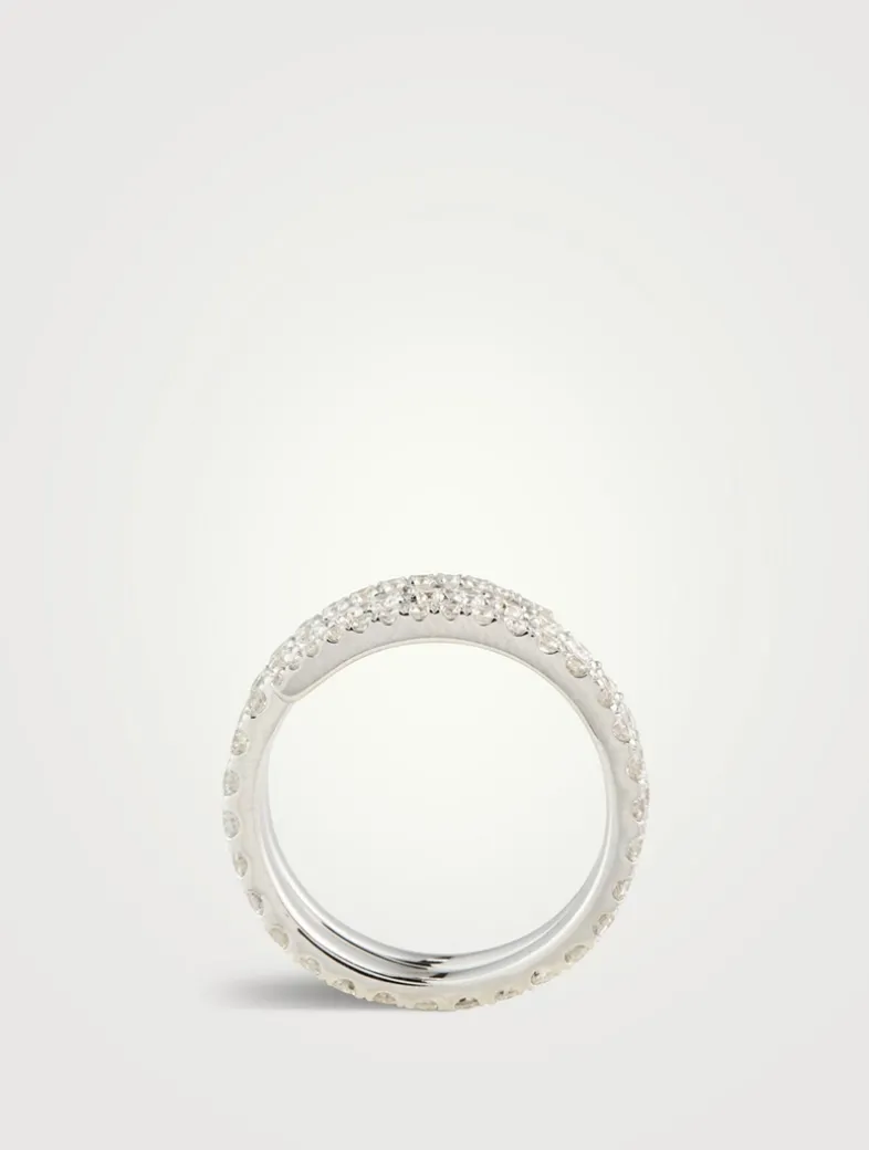 Cast in 18k gold, this coil ring is surrounded with pavé diamonds.