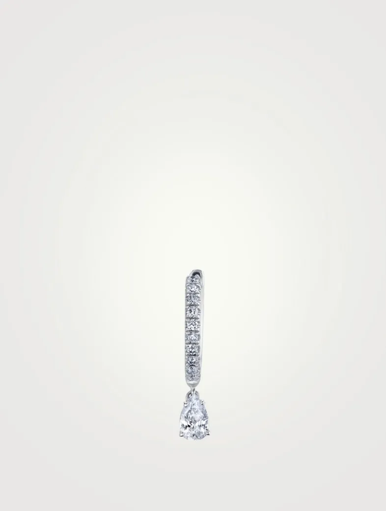 A single earring, this slim hoop is traced with pavé diamonds and accented with a dangling pear diamond.