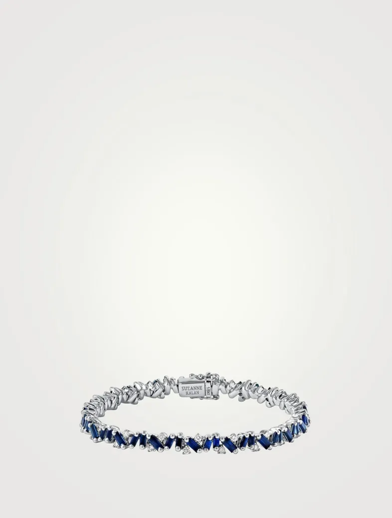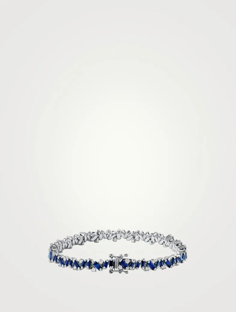Handcrafted in white gold, this tennis bracelet features 6.60 carats of baguette-cut sapphires, seamlessly paired with radiant round diamonds. The slender piece is finished with a logo safety clasp.