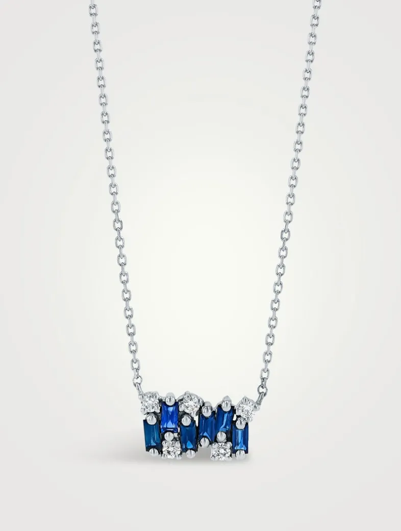 A classic example of Suzanne Kalan’s aesthetics, this necklace is modern but elegant. Crafted in 18k gold and set with sapphire baguettes, studded with round diamonds and suspended on a simple chain.