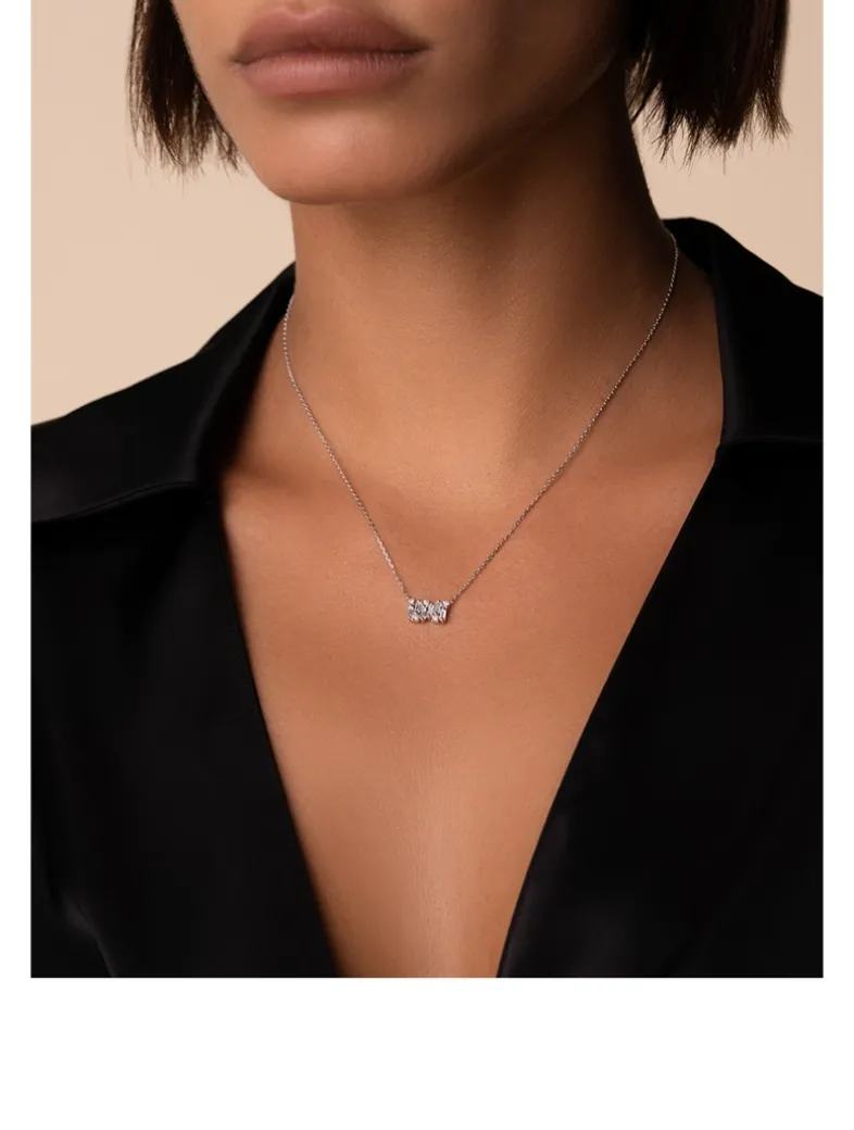 A classic example of Suzanne Kalan’s aesthetics, this necklace is modern but elegant. Crafted in 18k white gold and set with white diamond baguettes, studded with round diamonds and suspended on a simple chain.