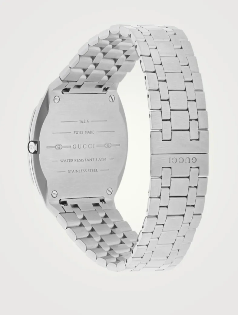 Crafted in stainless steel, this round face watch is designed with a multilayered case. The Swiss-made bracelet watch is finished with a silver brass dial with GG detailing and five-links strap.