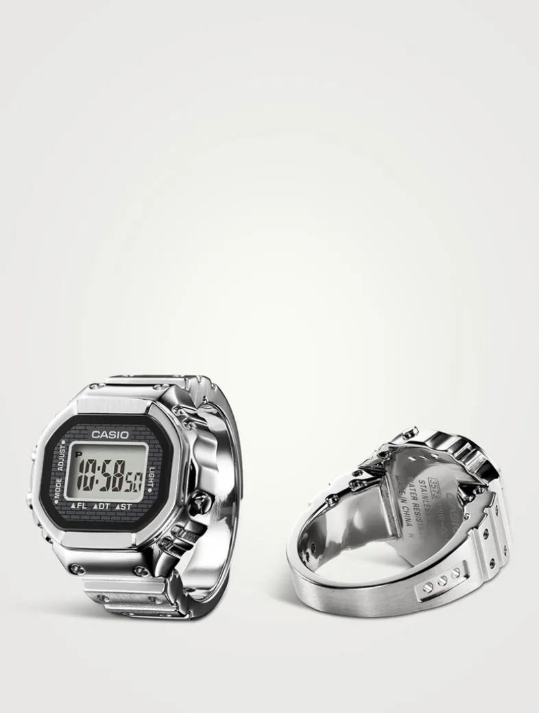 To celebrate 50 years of Casio watches, Casio reintroduces its first-ever ring watch—a playful yet practical digital timepiece miniaturized with advanced metalworking and MIM (Metal Injection Molding) technology. Made from a single piece of metal with water-resistant sealing, it features a 7-segment LCD displaying time, date, dual time, and stopwatch, plus a subtle flashing light as a nod to the fleeting nature of time. Sized to fit a US 10.5 (EU) ring with two included spacers, it’s powered by a downsized module and button battery—all in a sleek, full-metal ring.