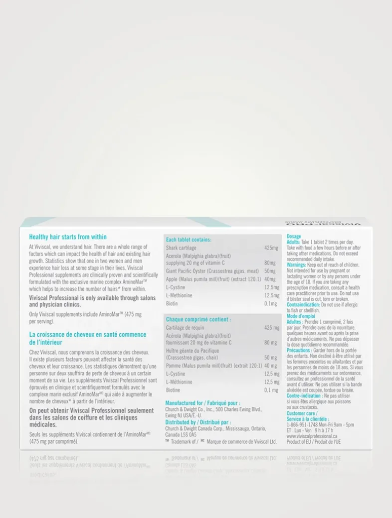 Viviscal Professional dietary supplements are scientifically formulated with the ground-breaking, exclusive marine complex AminoMar®, which helps to nourish thinning hair from within and promote existing hair growth. Along with AminoMar, Viviscal Professional hair growth supplements also contain key nutrients essential for healthy hair growth, including Biotin, Apple Extract and Vitamin C.