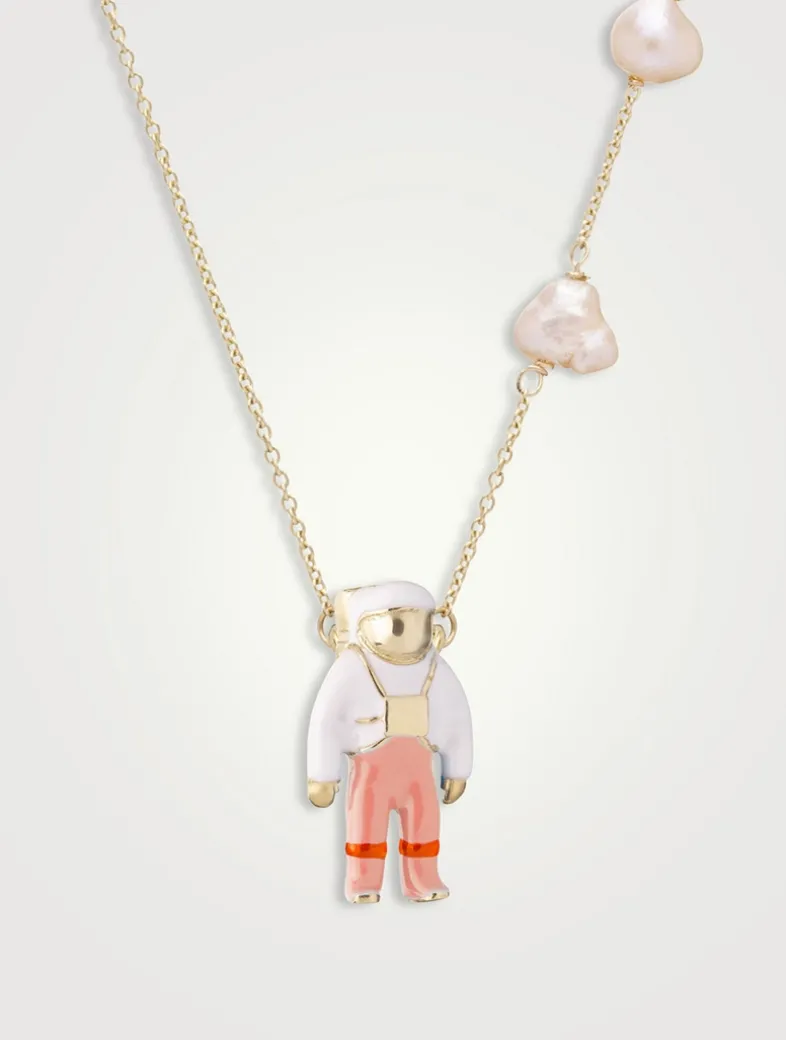 The Astronauta necklace (astranaut) is dedicated to women in Science. Set on an adjustable rolo chain, this necklace features a handpainted enamel astronaut alongside pearls that symbolize meteors and planets floating in space.