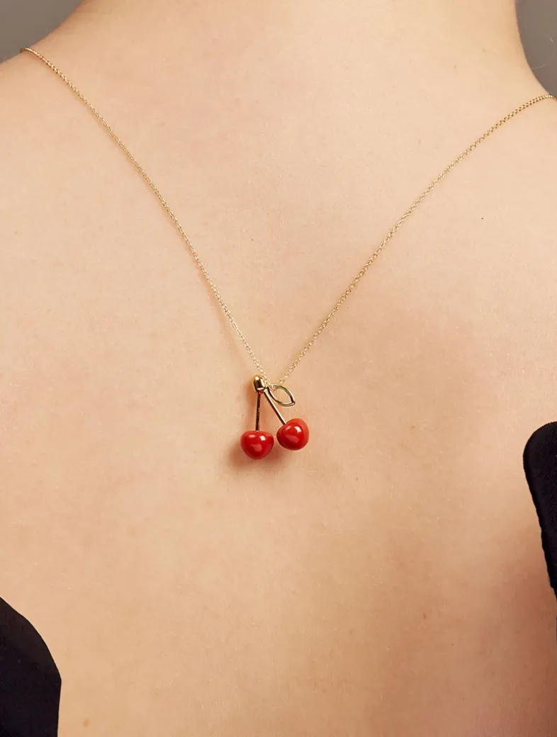 Set on an adjustable mixed-link chain, this necklace features an intense red coral cherry pendant.