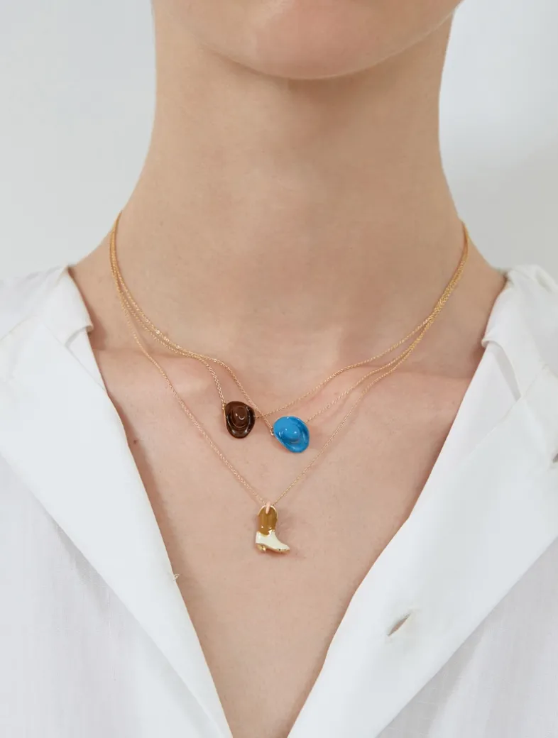 Set on an adjustable rolo chain, this necklace features a handpainted enamel cowboy hat pendant.
