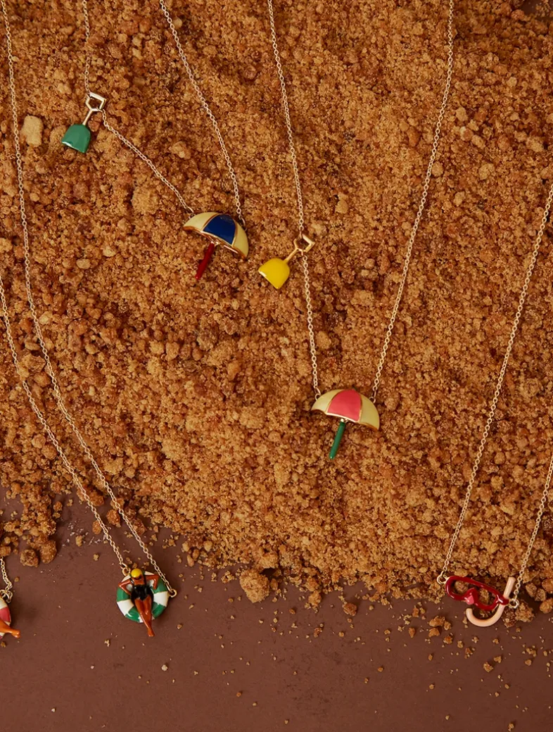 Set on an adjustable rolo chain, this necklace features handpainted enamel beach umbrella and sand shovel charms.