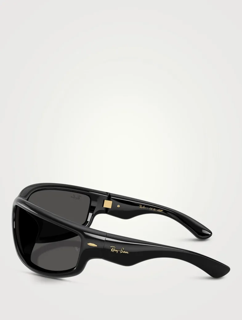 The Ultra Wrap 003 by A$AP Rocky from the Next Generation collection features bold wraparound lenses, thick curved temples, and a sleek, futuristic silhouette. Inspired by street style and built to stand out, this next-gen design commands attention in striking black. This style is not Rx-able.