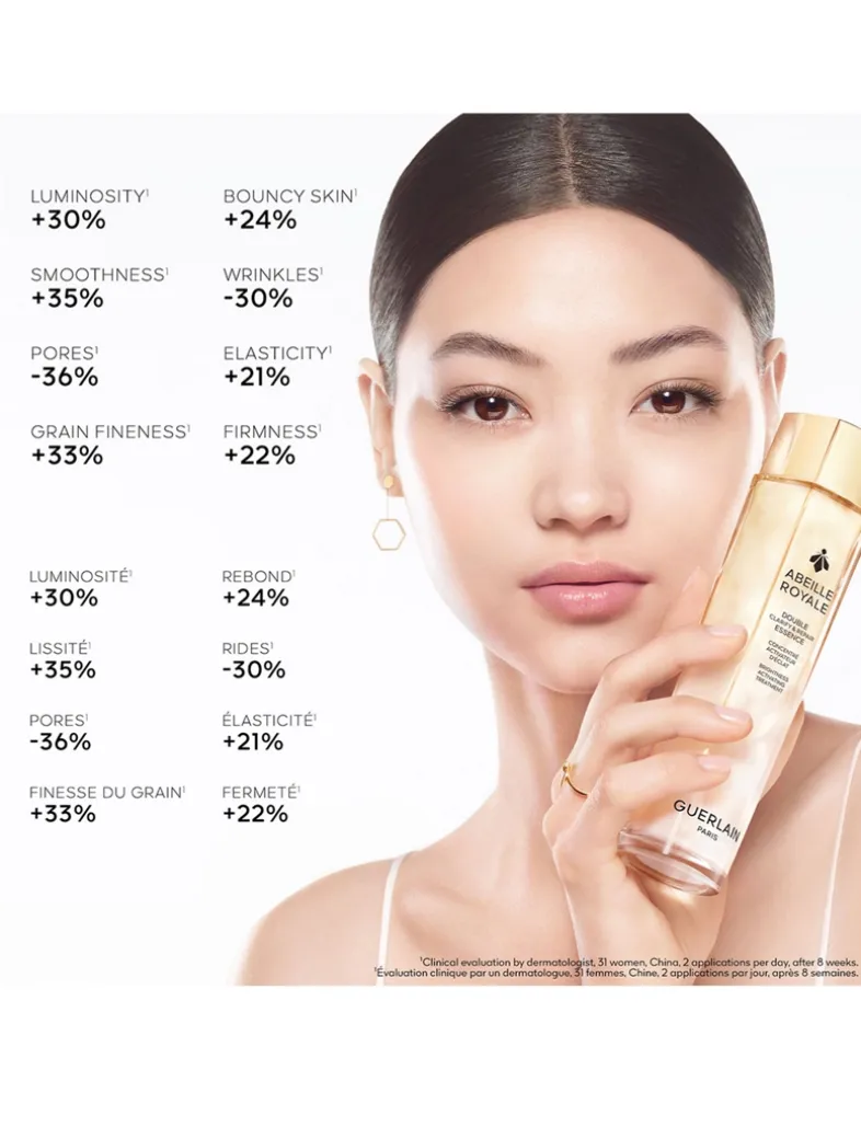The Double Clarify & Repair Essence brings together the power of two exclusive technologies to reveal skin’s youthful radiance: Dynamic Blackbee Repair technology and a powerful brightness-activating concentrate combining the power of white honey, vitamin C and AHA. They respectively stimulate the key mechanisms of skin’s repair process and enhance skin clarity. Day after day, pores are refined, skin is smoother and appears visibly younger. Double Clarify & Repair Essence is formulated with 93% naturally-derived ingredients.