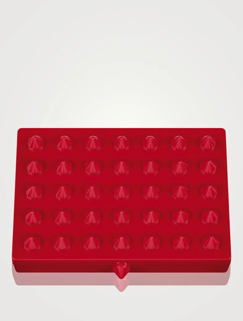 Its nomadic tone-on-tone red case, dressed with Louboutin signature spikes, features a large mirror and a double-ended brush applicator: a foam tip to apply, and a brush with soft synthetic bristles to blend.