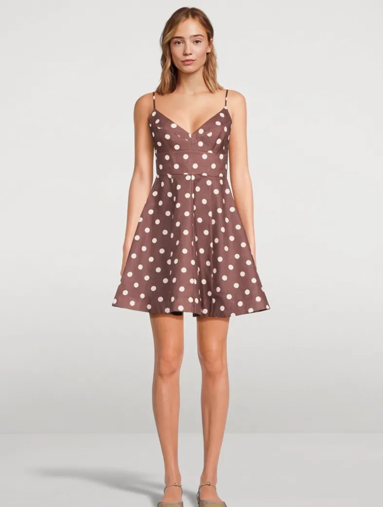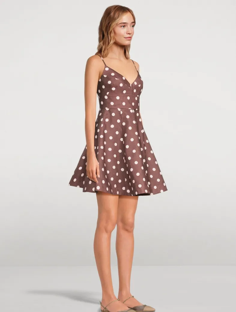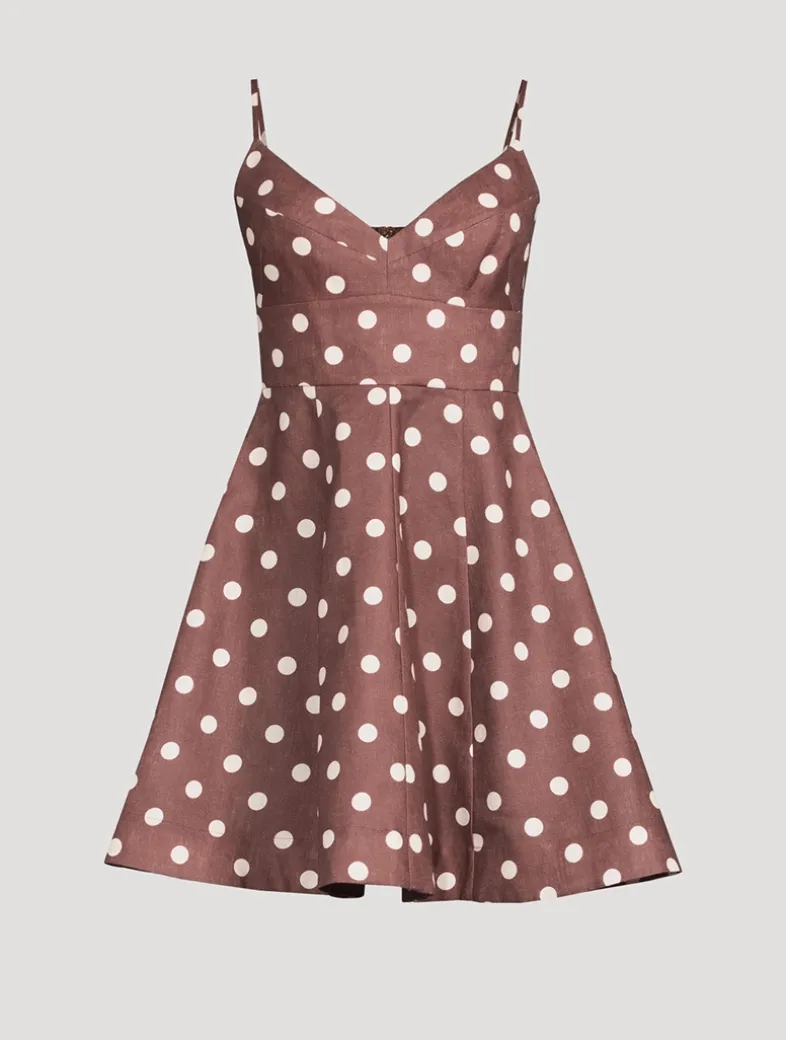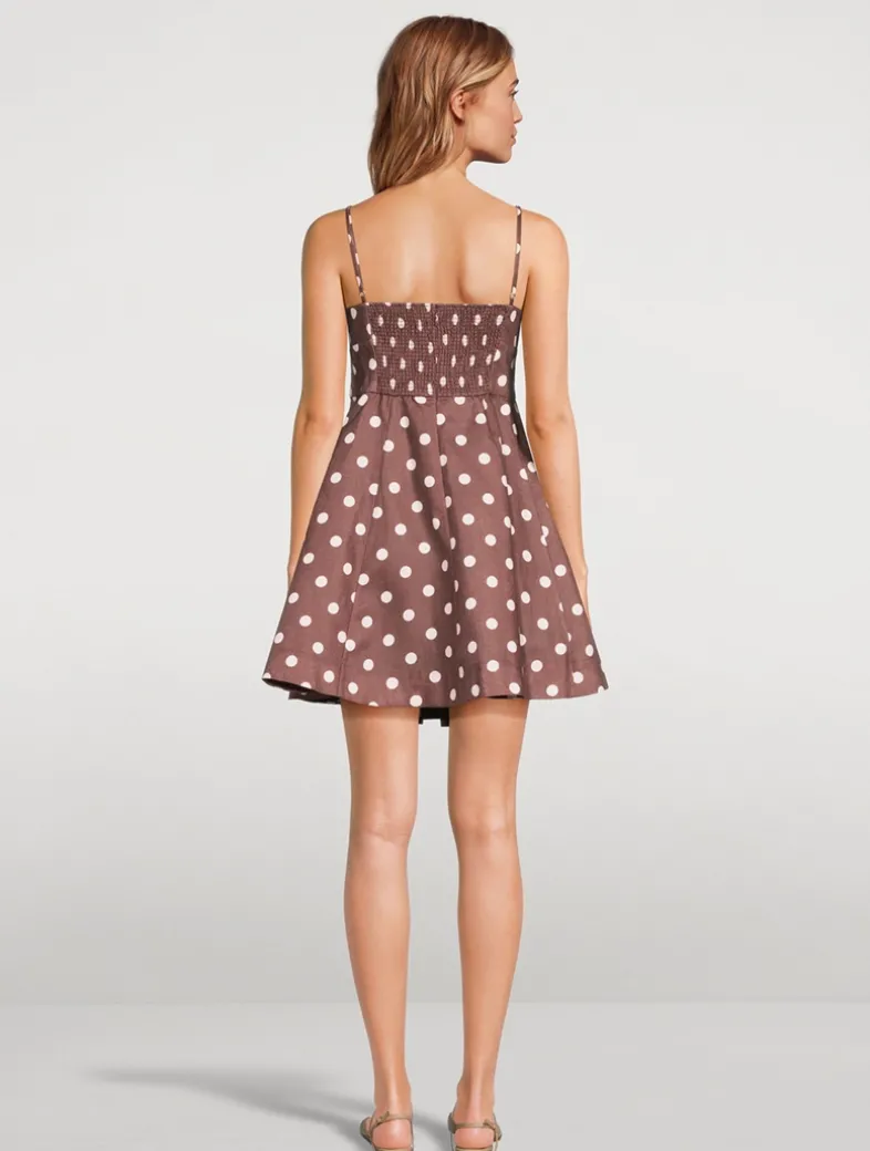 Flaunting a vintage aesthetic, this linen mini dress is printed with a classic polka dot motif. It has seaming at the bodice, lending a lingerie-inspired touch to the piece.