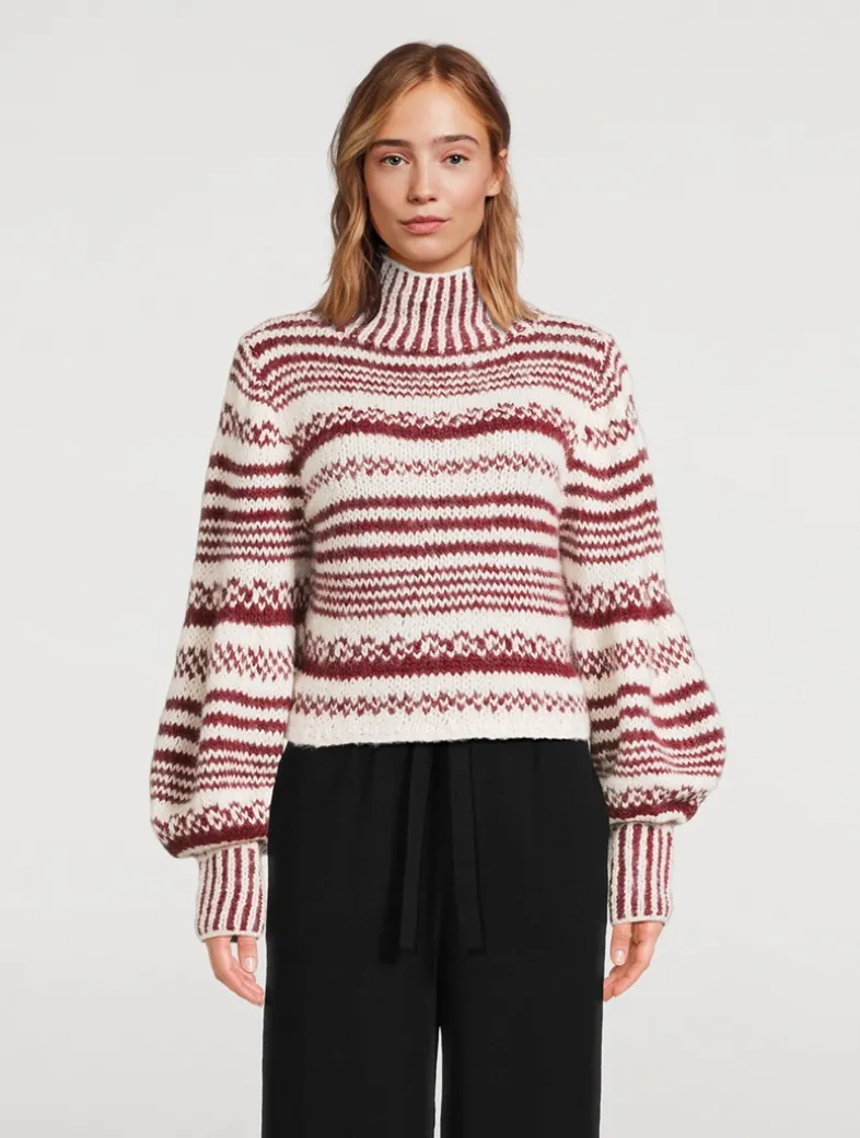 Crafted by skilled artisans in Peru, this luxurious high-neck sweater features elegant billowed sleeves and is developed using an intricate intarsia technique. Each piece is handknit with care, honouring traditional craftsmanship.