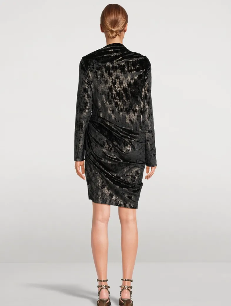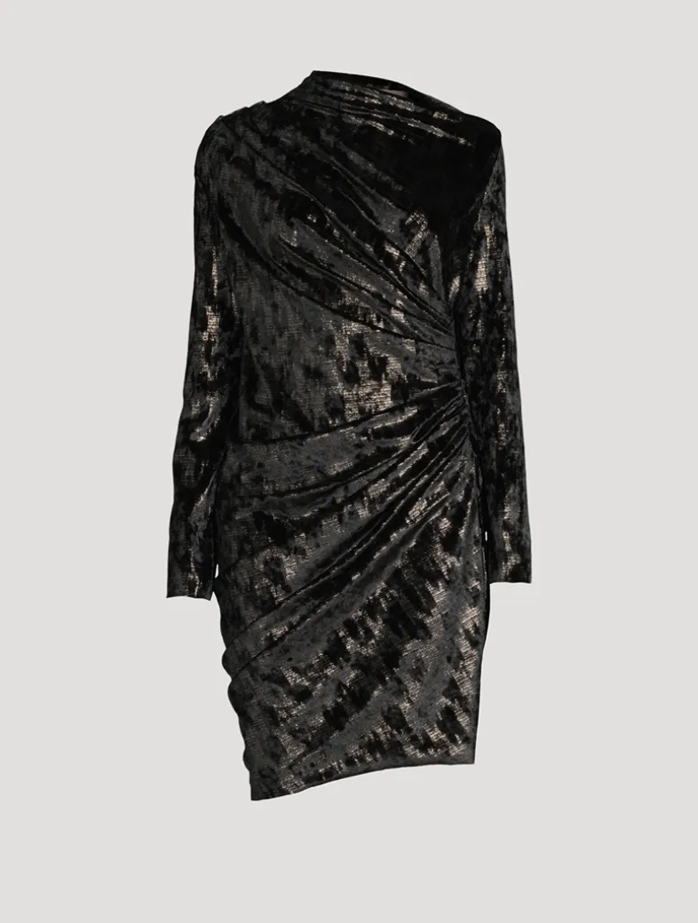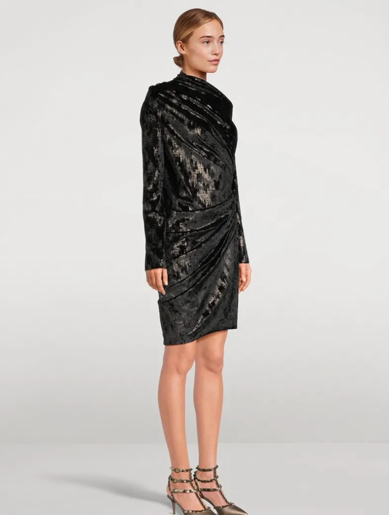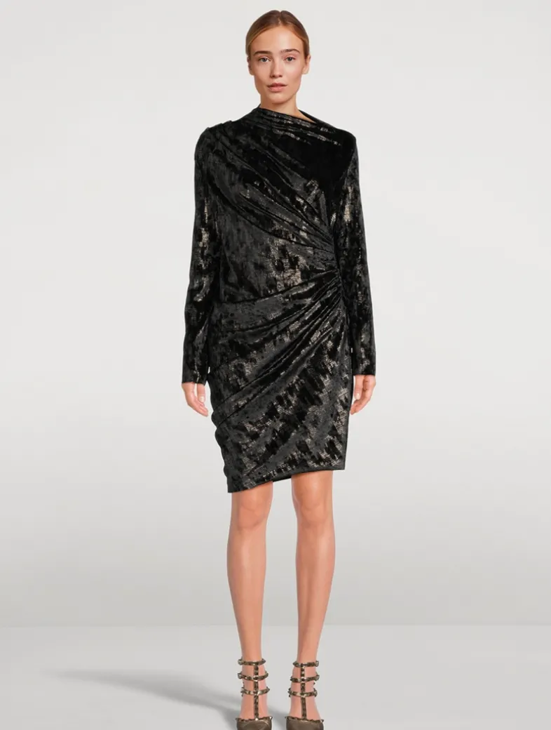 An asymmetric neckline reveals a hint of skin at the shoulder of this chic cocktail dress, lending a modern feel to a classic piece. Crafted of velvet with a shimmering finish, it is cut in a fitted silhouette with side ruching and a knee-length skirt.