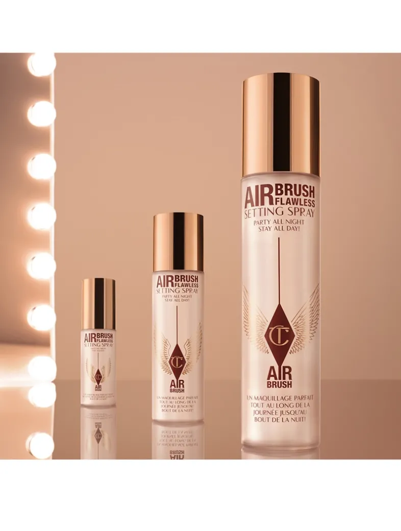 A hydrating, alcohol- and oil-free spray that weightlessly sets makeup for up to 16 hours without melting, fading, or settling into fine lines. The Airbrush Flawless Setting Spray weightlessly primes and sets for up to 16 hours to instantly lock in your makeup look for a flawless, long-lasting, pore-blurring finish. It also features a delicate fresh floral scent. Now available in a limited edition jumbo size!